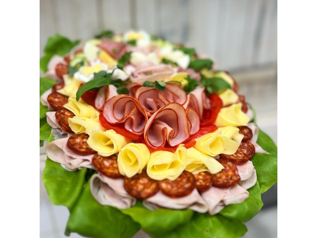 Lahodný zážitok plný šunky, údenín, syrov a parížskeho šalátu. Zloženie: Parížsky majonézový šalát, 5x vajce, bravčová pražská šunka, debrecínska šunka, syr eidam, saláma, údená klobáska, encián, syrové nite, zelenina - zdobenie. Fotka je ilustračná, Majiteľ si vyhradzuje právo na drobné úpravy dizajnu.