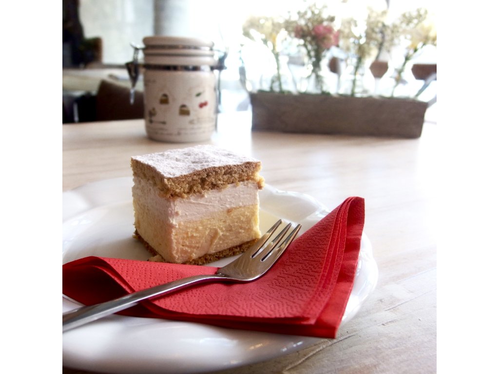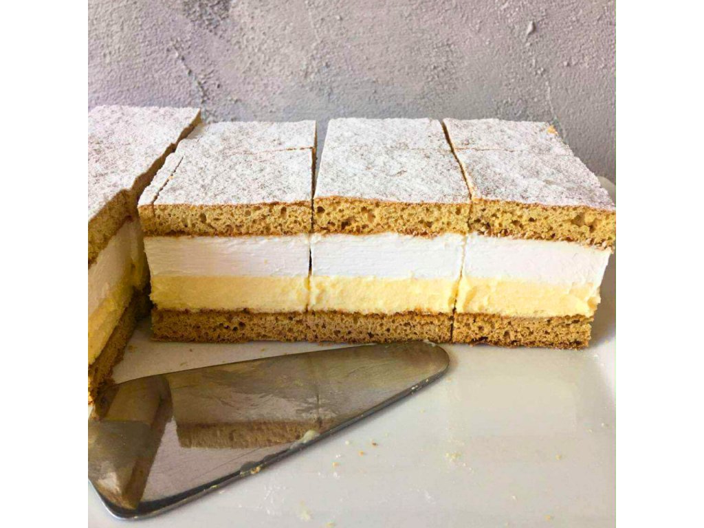 Zloženie: Medové pláty, vanilkový pudingový krém, živočíšna šľahačka.